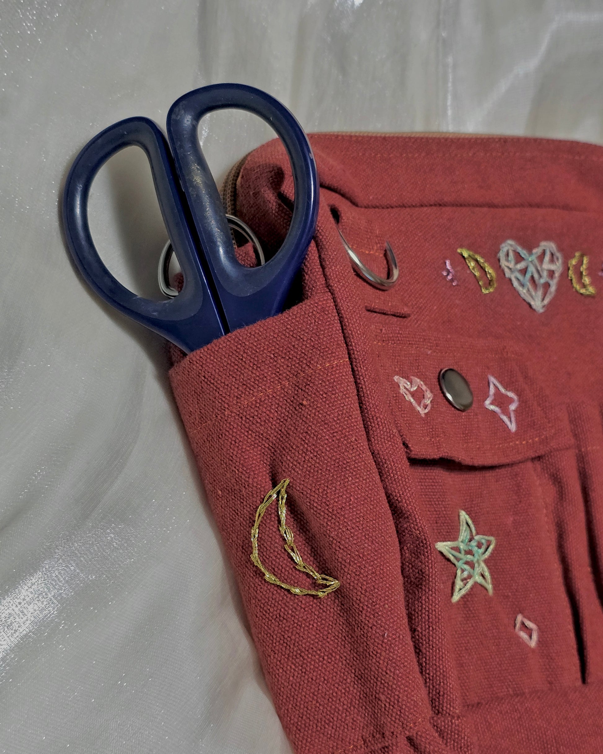 The Moonphase is part of our bag collection. This was designed to be your dream companion for every little adventure. It is crated with pockets at all sides and features a roomy interior. It comes with 2 short straps and 1 adjustable sling strap. And each bag is hand-embroidered for the unique you.